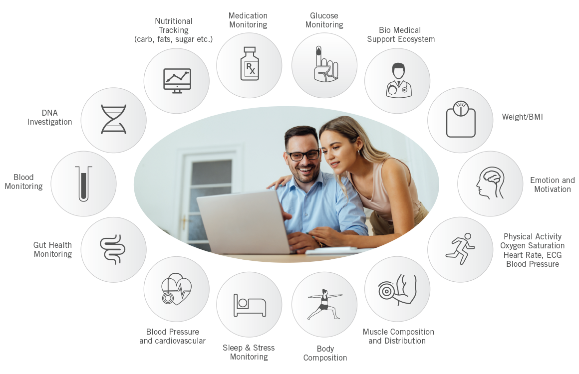We provide the most integrated access to your healthcare data. Get access to healthcare data from Biomedical testing, real time body function monitoring and more to empower you to make precise, well-informed choices regarding your fitness strategy and lifestyle management.